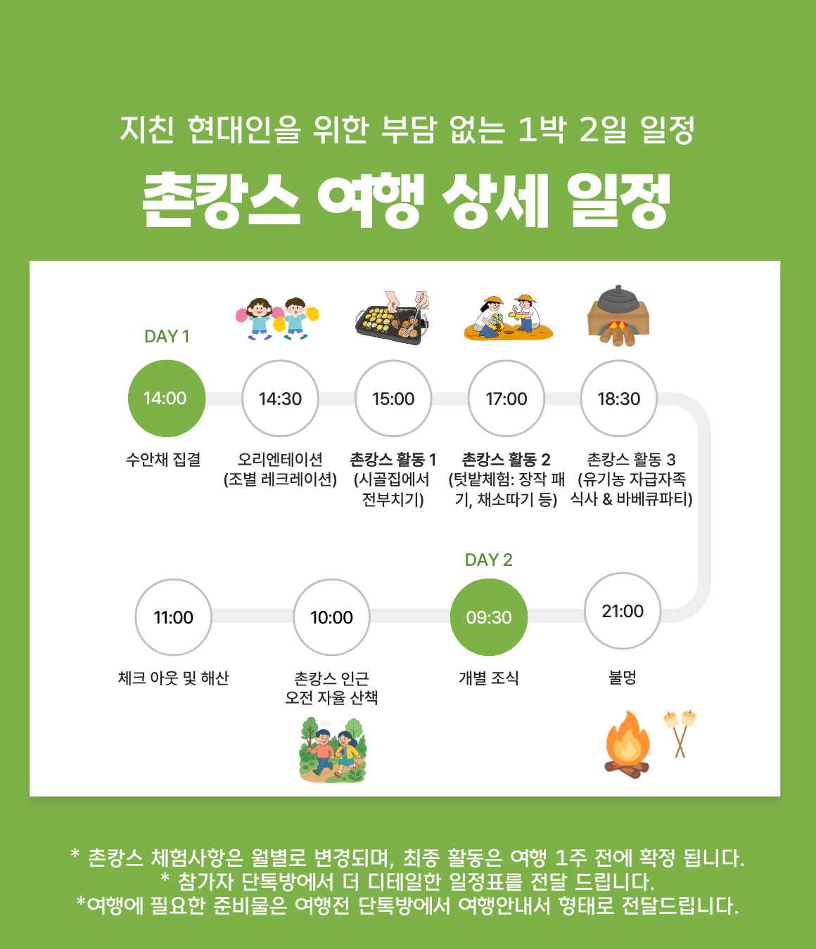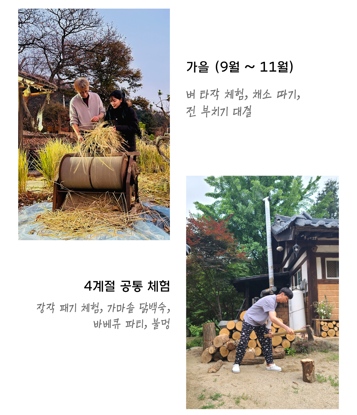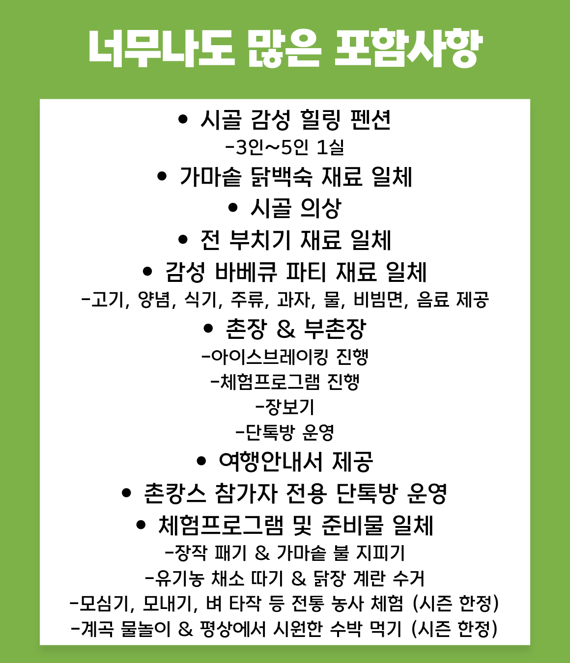 • 공통체험: 전부치기, 가마솥 닭백숙, 장작패기, 닭장 계란 수급, 불멍, 바베큐파티 예정