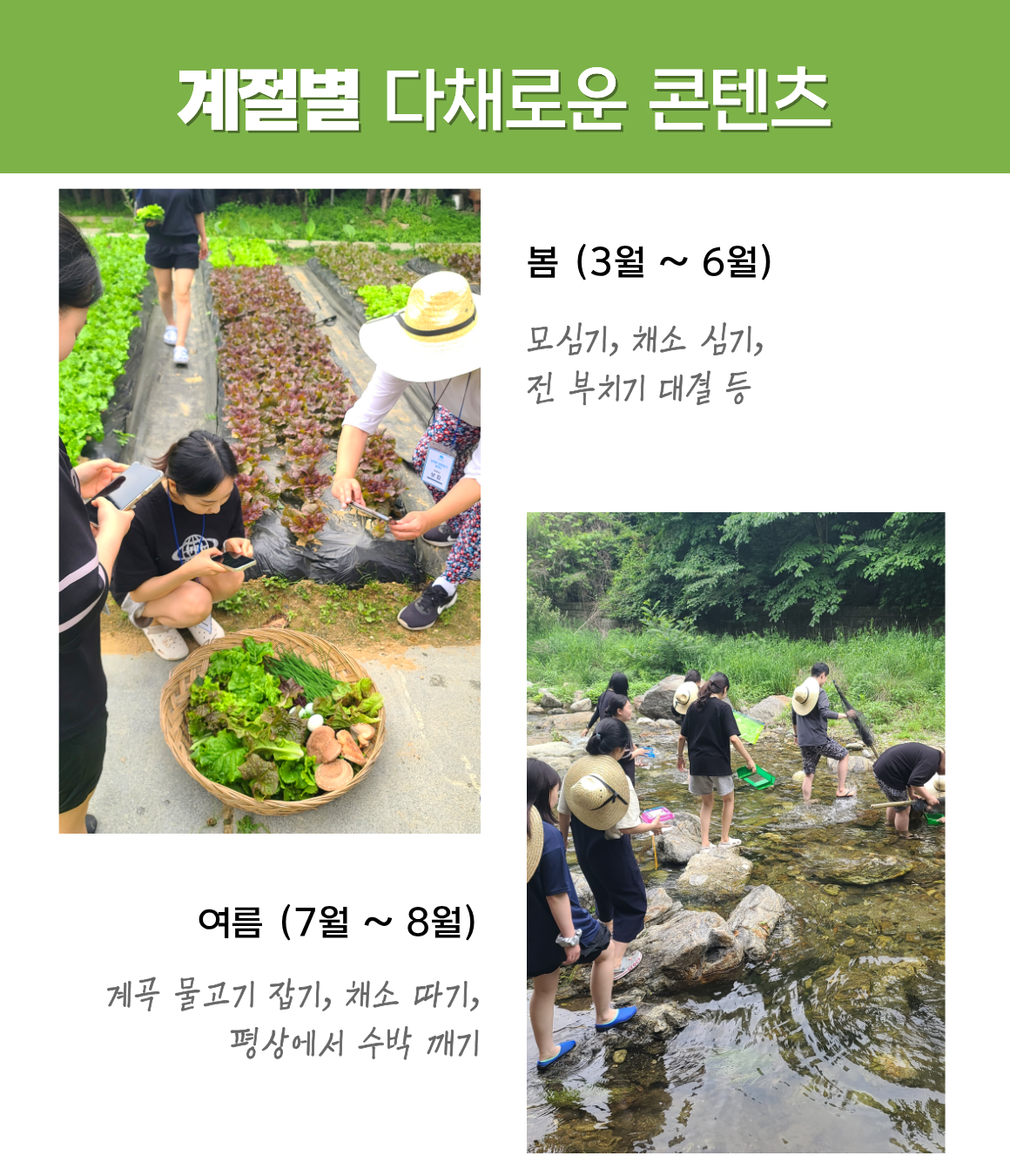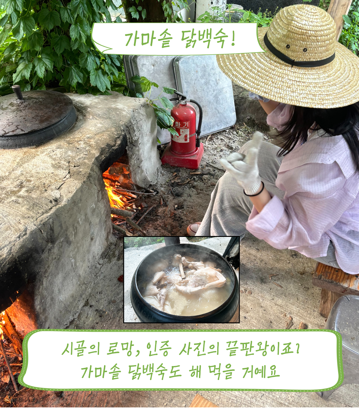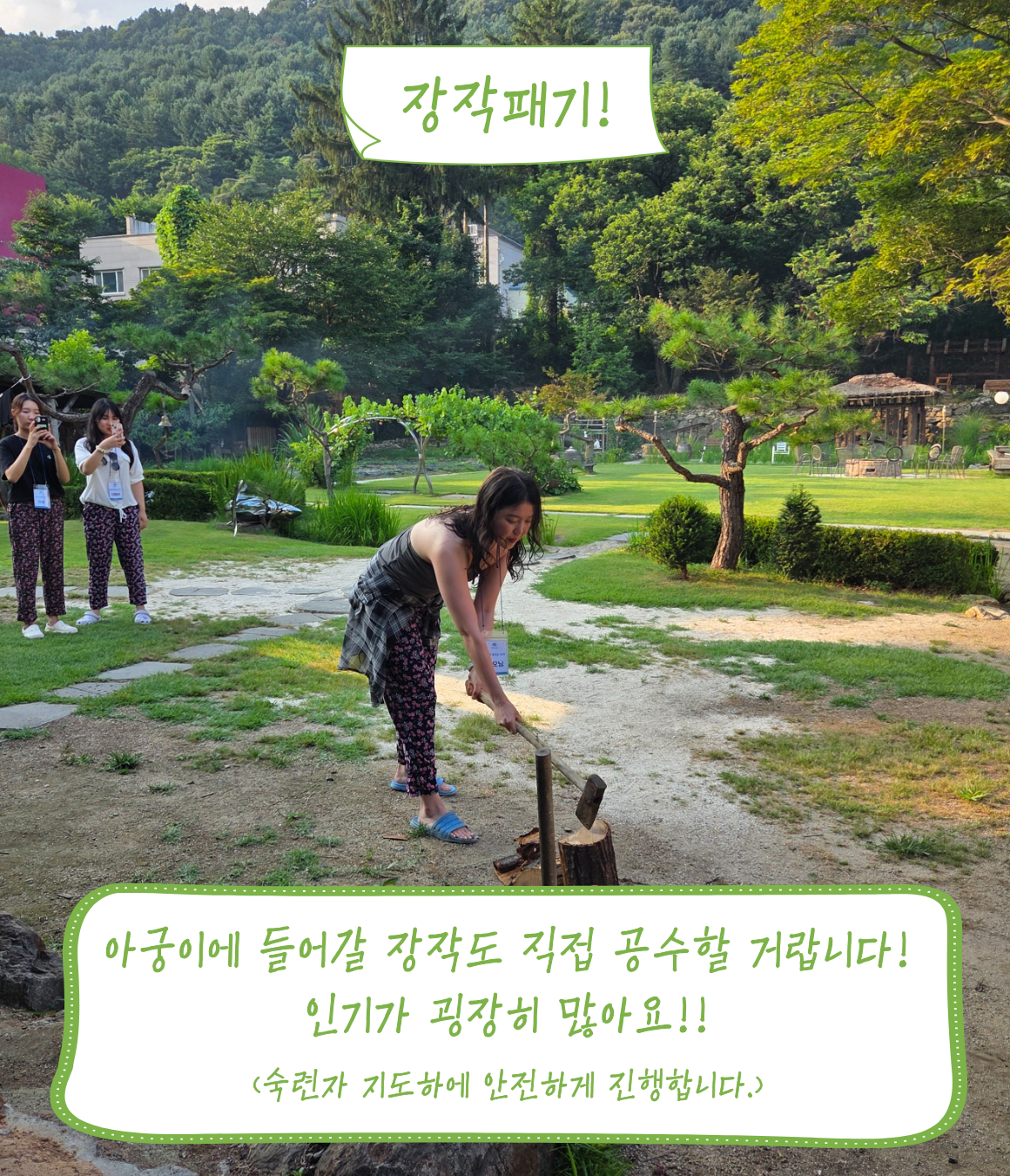 • 공통체험: 전부치기, 가마솥 닭백숙, 장작패기, 닭장 계란 수급, 불멍, 바베큐파티 예정