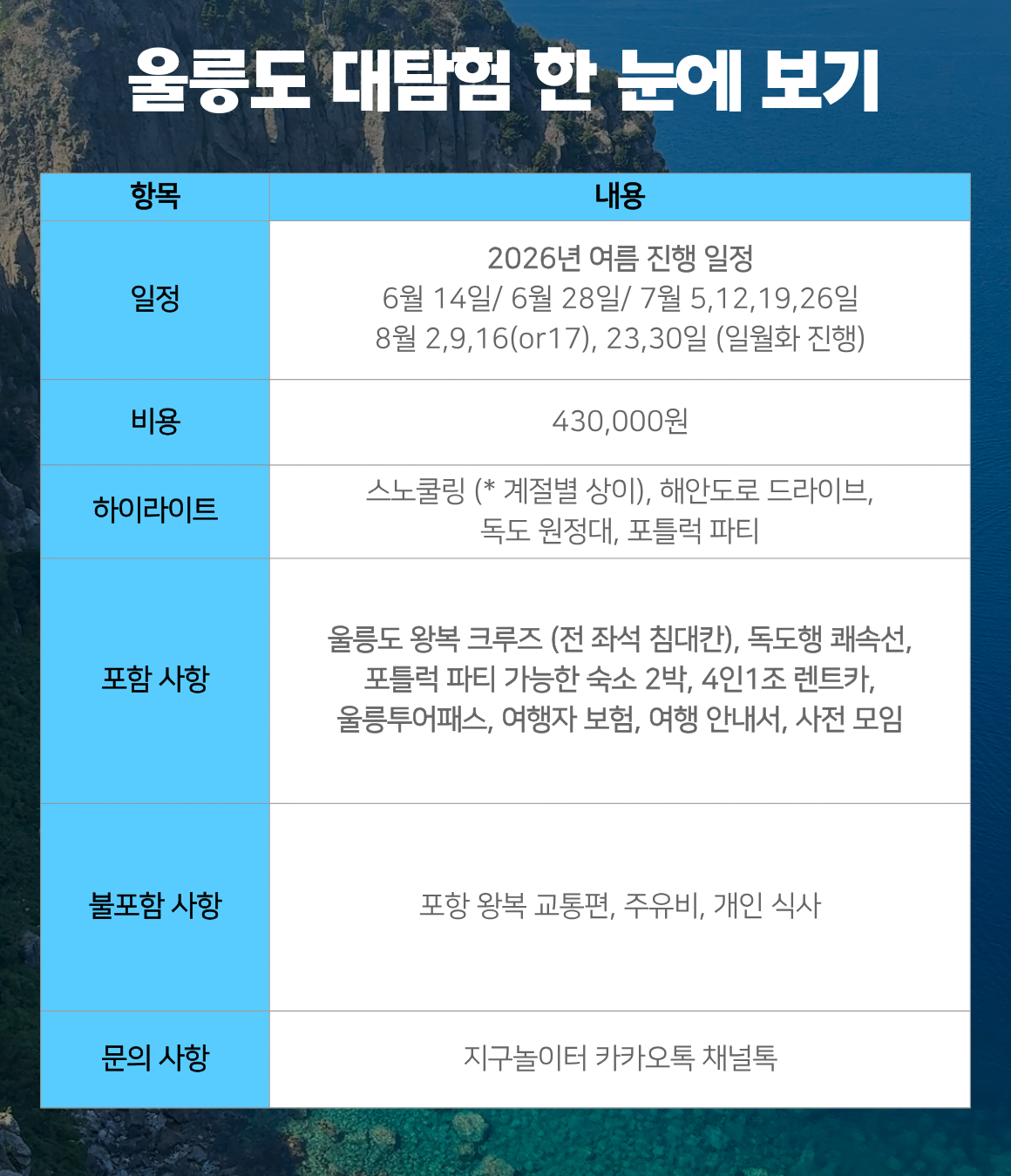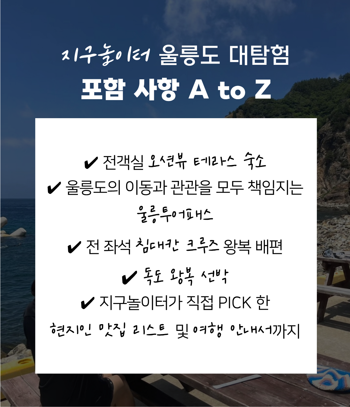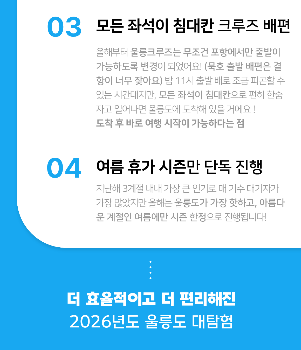 또한 지구놀이터가 이용 예정인 선박은 전 좌석이 침대칸으로 구성되어 있고, 밤 11시에 출발 → 오전 6시 도착 일정이라 한숨 푹 자고 일어나면 울릉도에 도착 해 있을거에요.